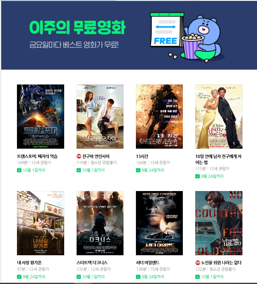 네이버에서 매주 금요일마다 영화를 무료로 대여하는 서비스입니다.